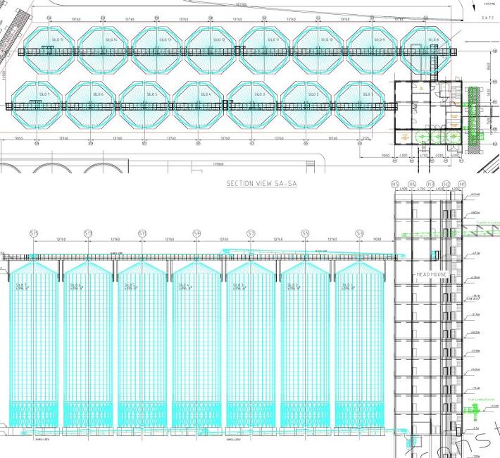 Project Description: The grain storage capacity of the Kuwait Flour Mills & Bakeries shall be extended by 50.000 t. The project comprises 15 steel silos, one head house and two conveyor bridges. The steel silos with hoppers are supported by circular rows of steel columns. The head house consists of 12 levels above ground and two levels in a basement